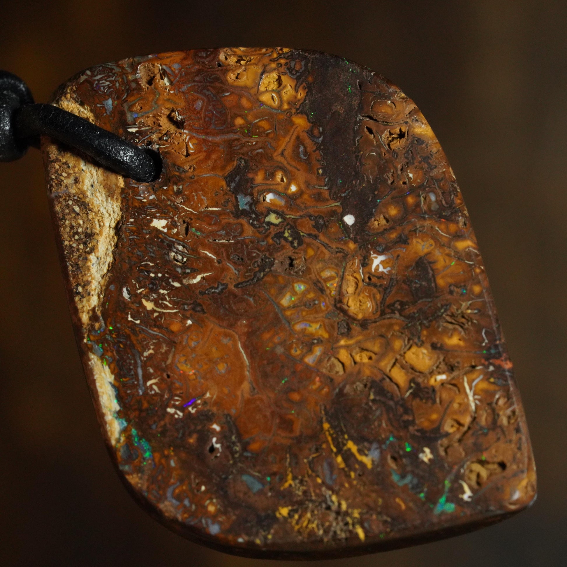 This pendant carries its own natural pattern of earthy ironstone with flashes of electric colour. No two pieces are ever the same. Finished on a durable leather cord, this necklace brings a touch of the Australian outback to your everyday wear — a raw, authentic gem for those who love something truly unique.